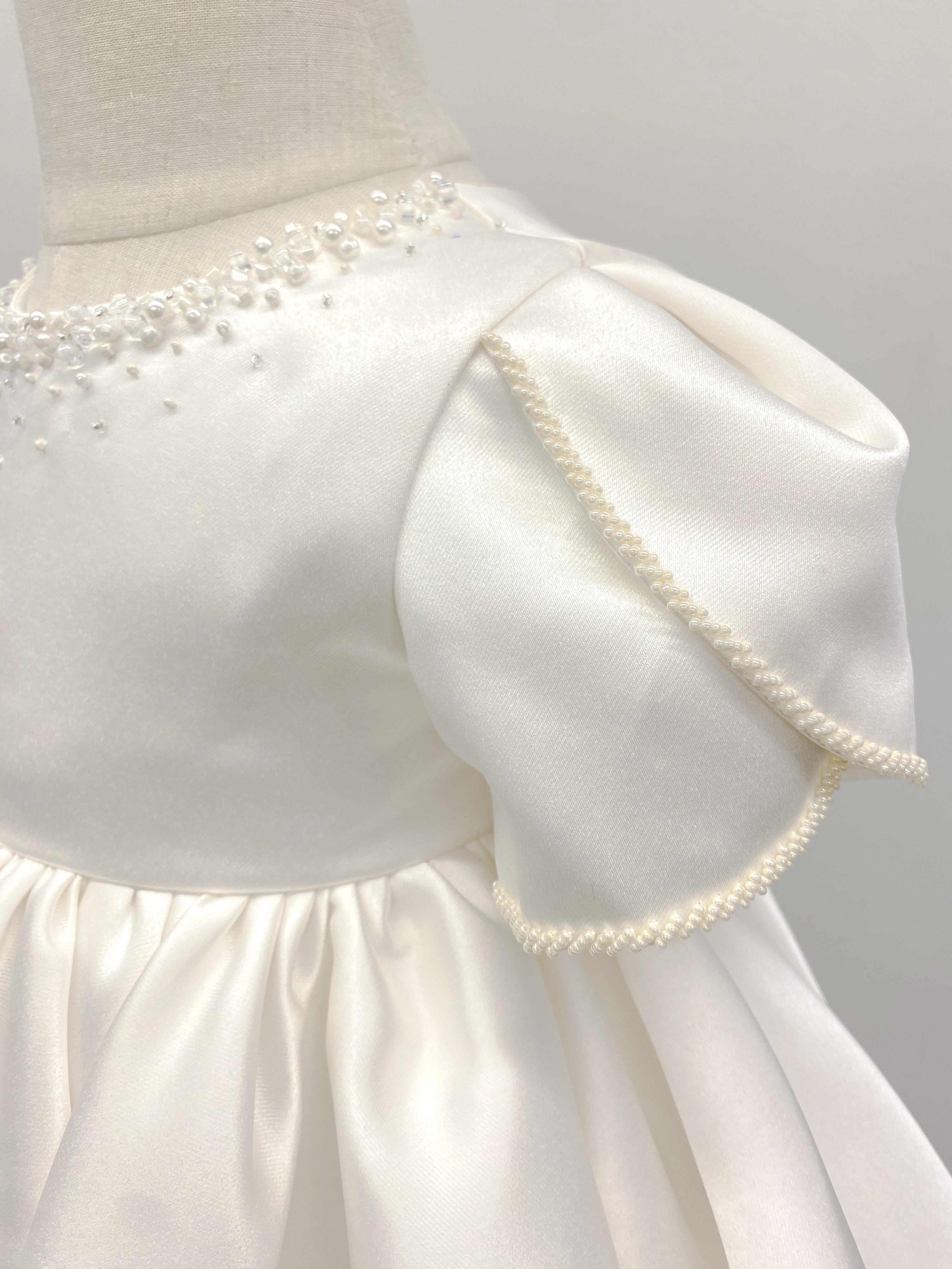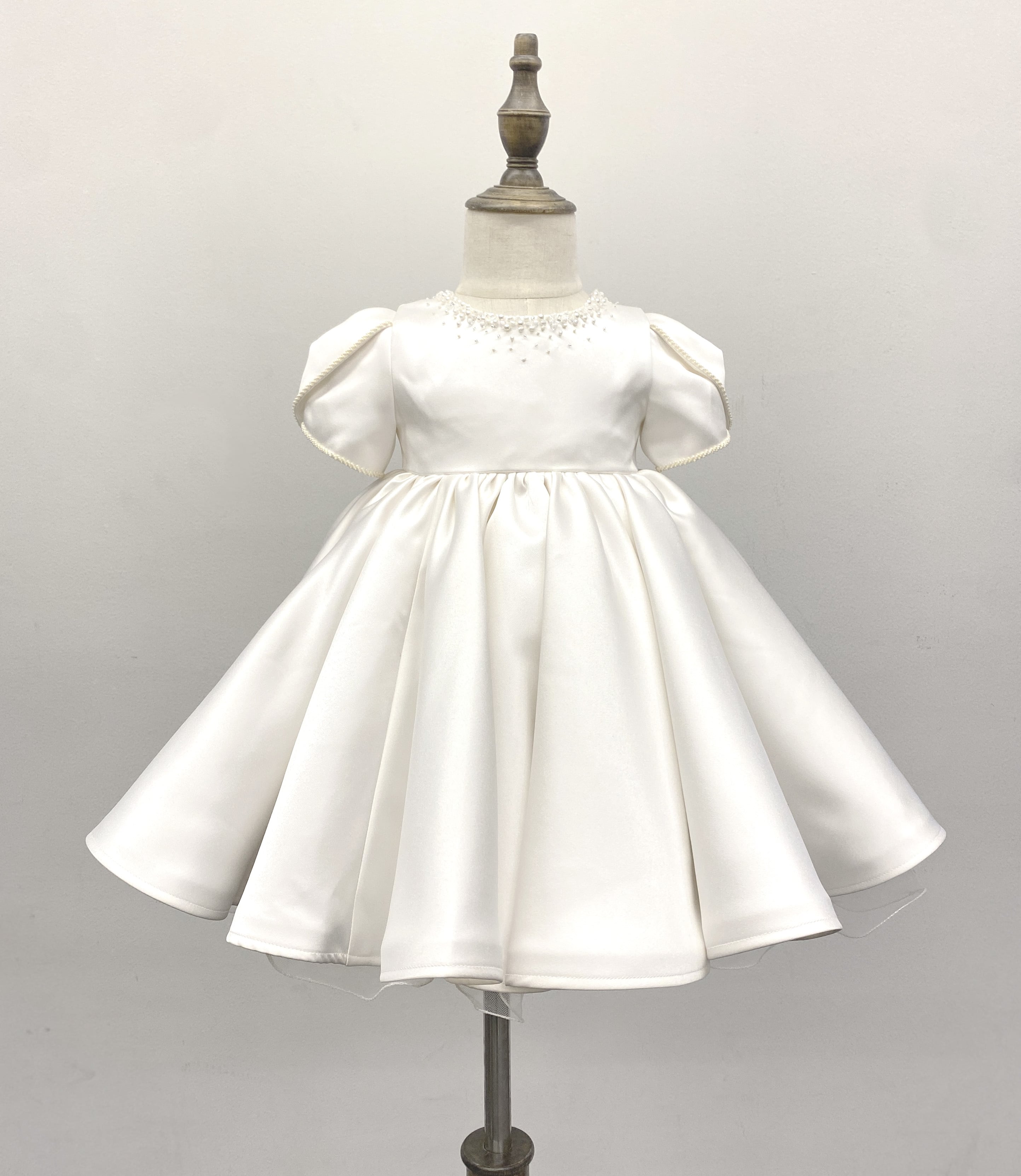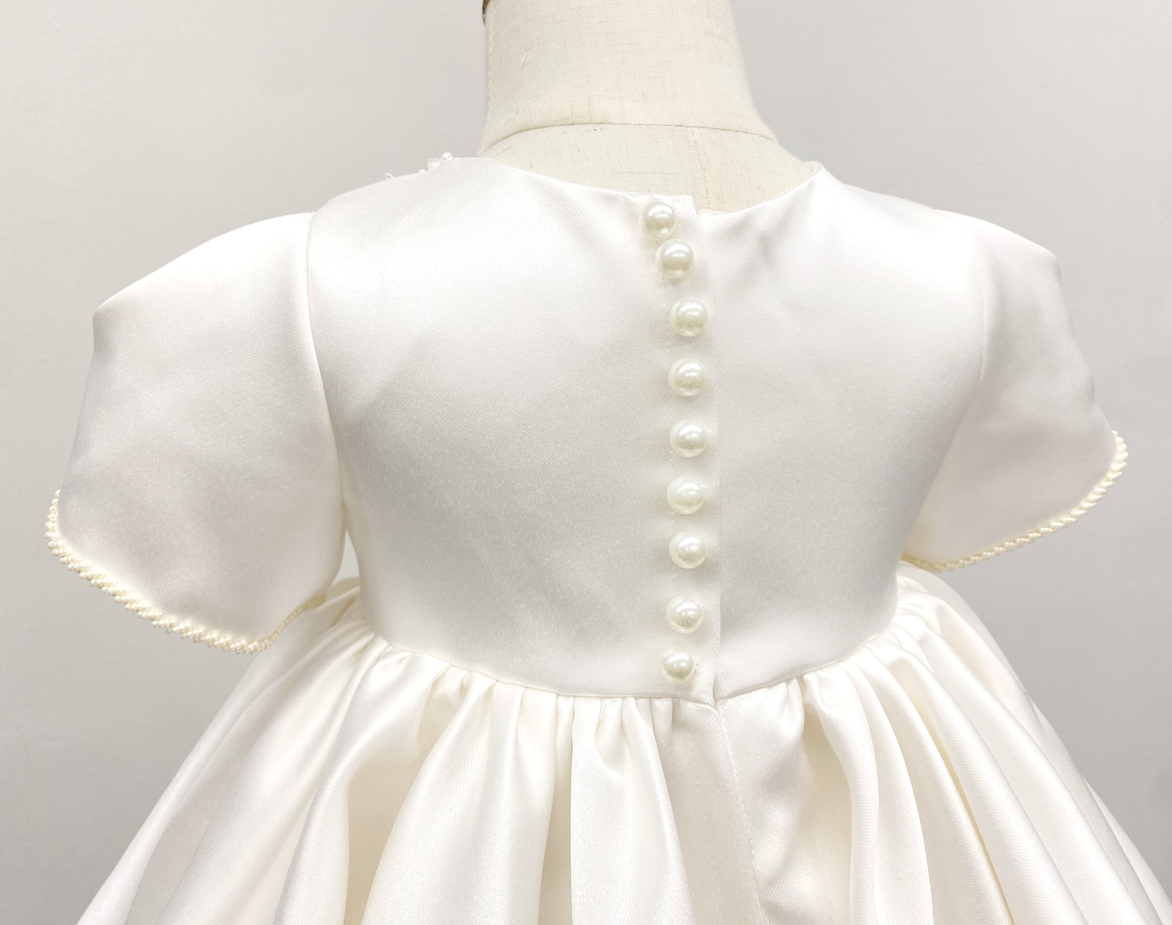 首元や袖端のビーズ刺繍が上品で、ボリュームのあるスカートが可愛らしいベビードレスです。