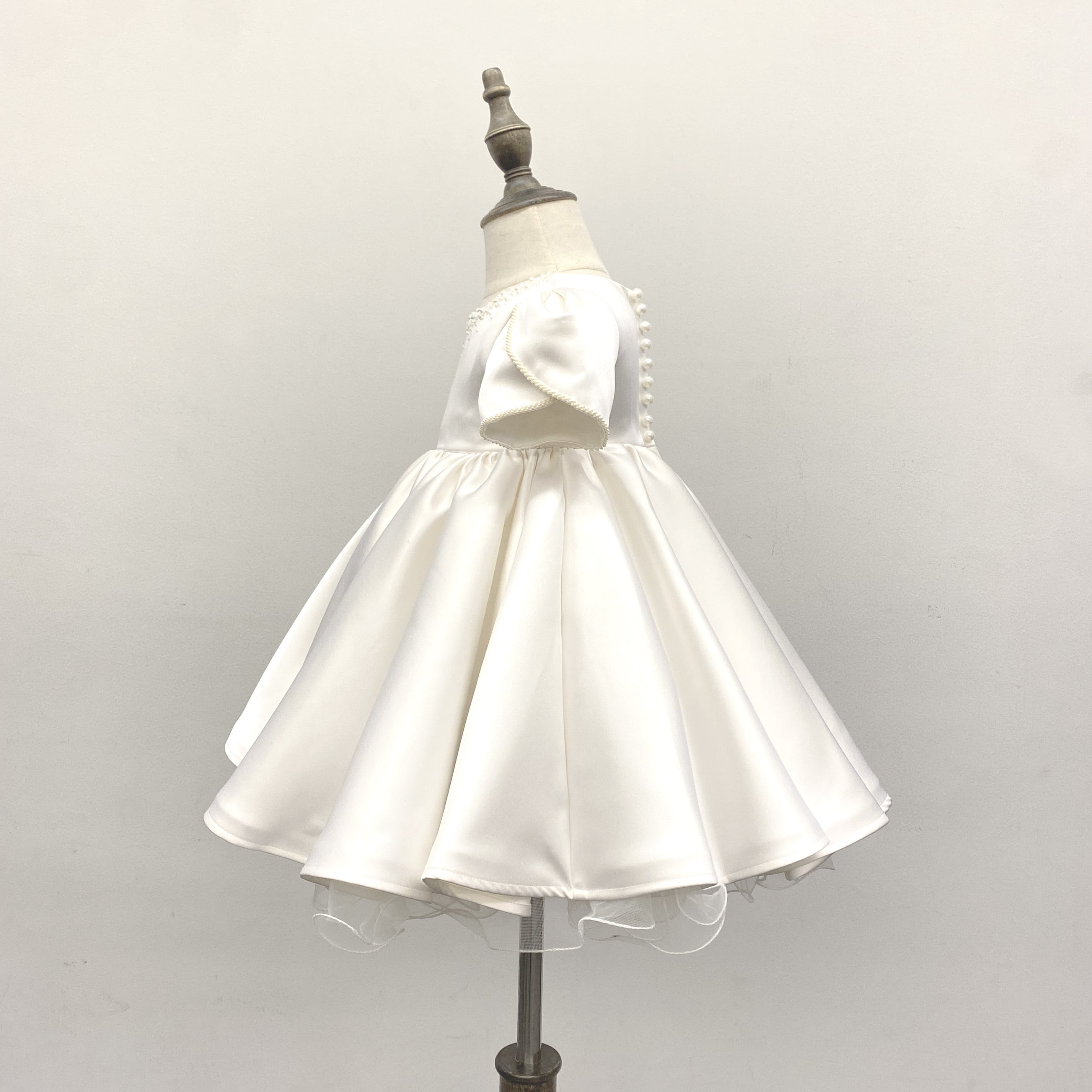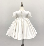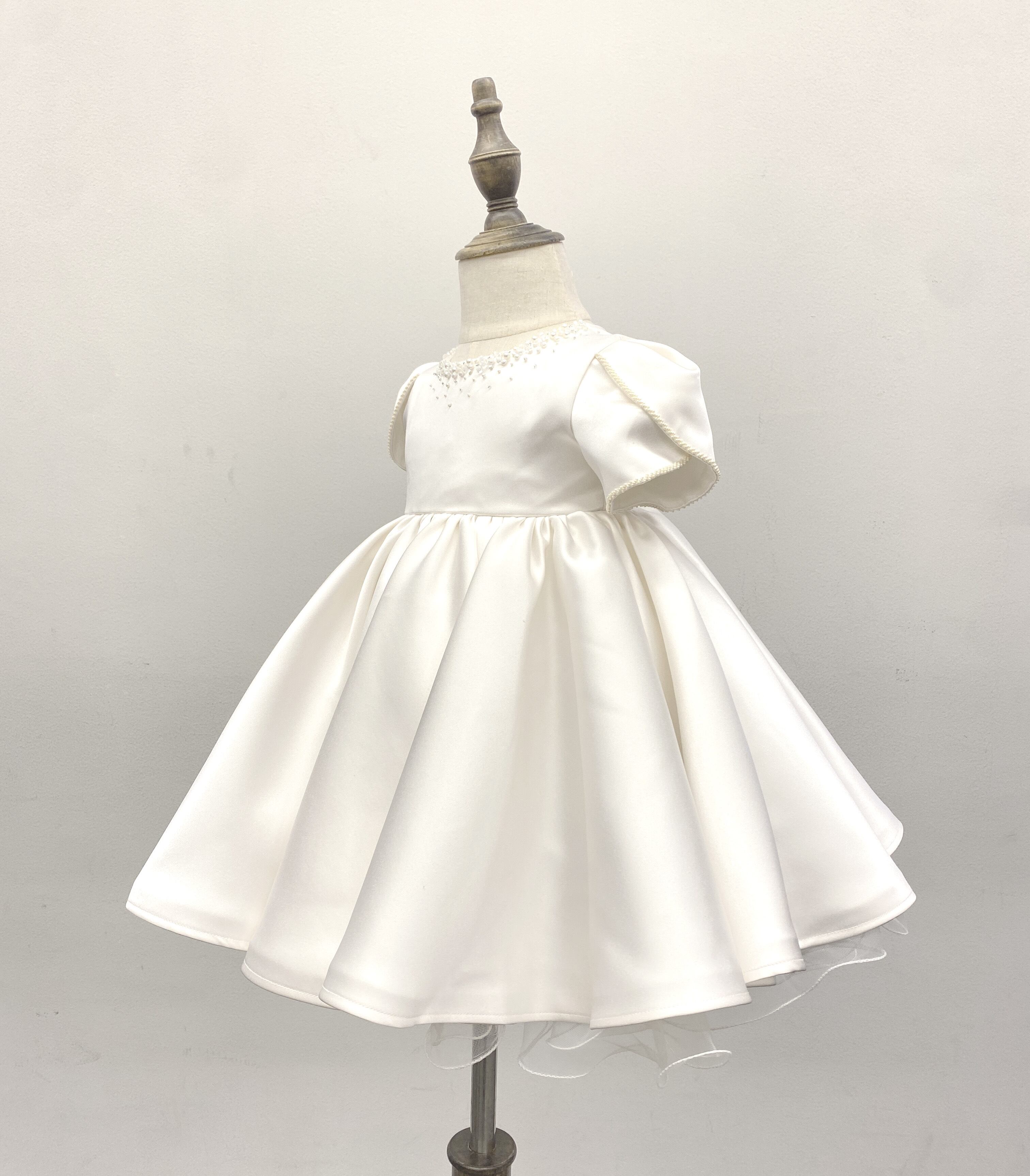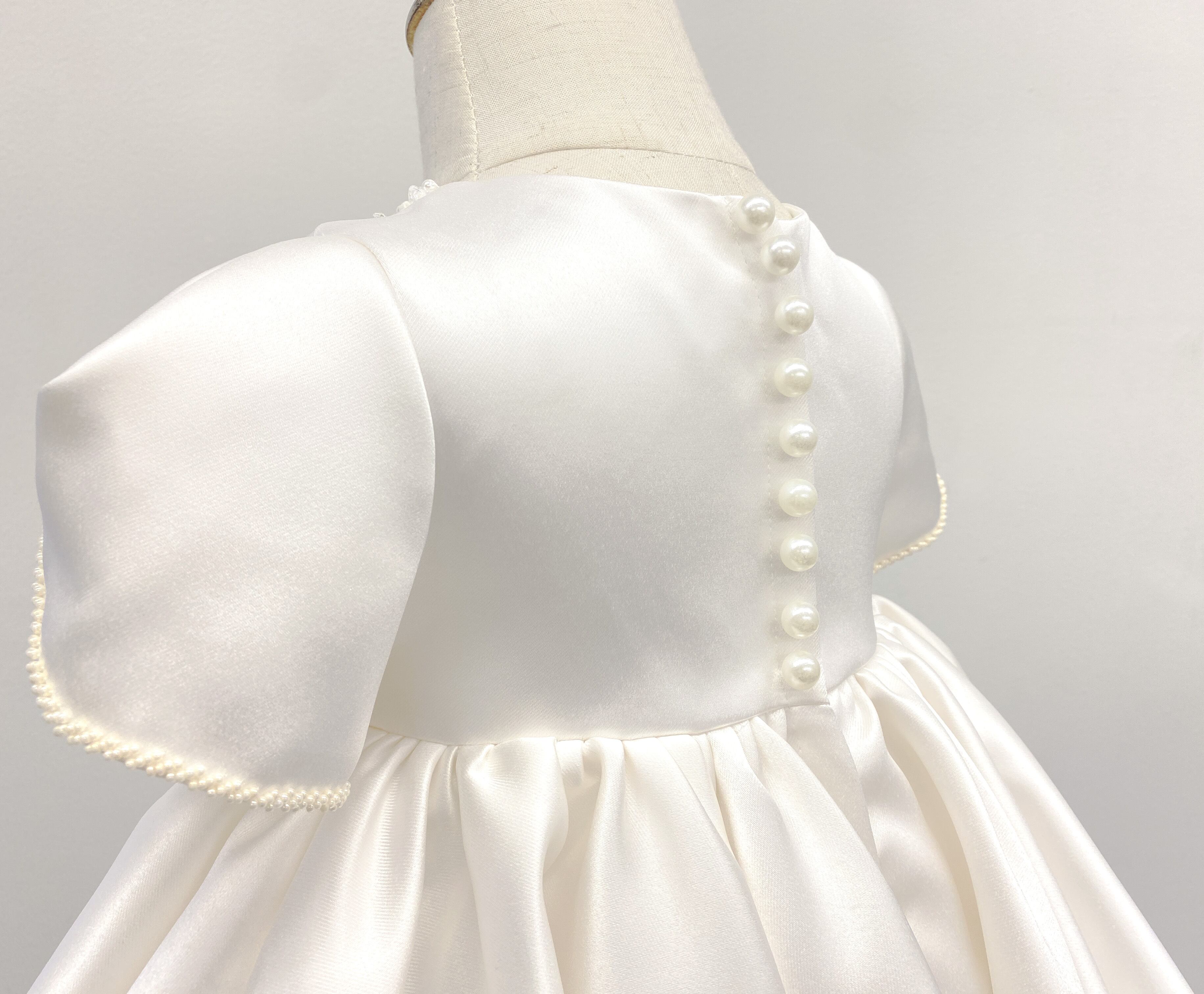 首元や袖端のビーズ刺繍が上品で、ボリュームのあるスカートが可愛らしいベビードレスです。