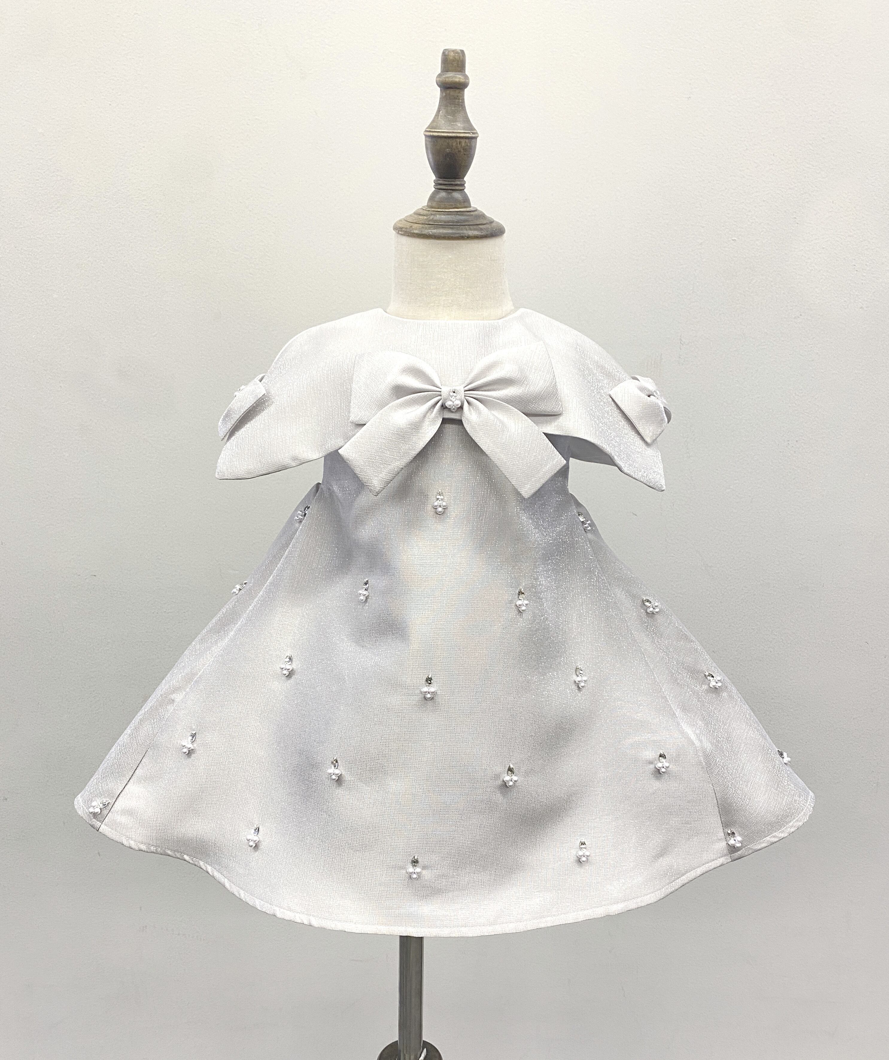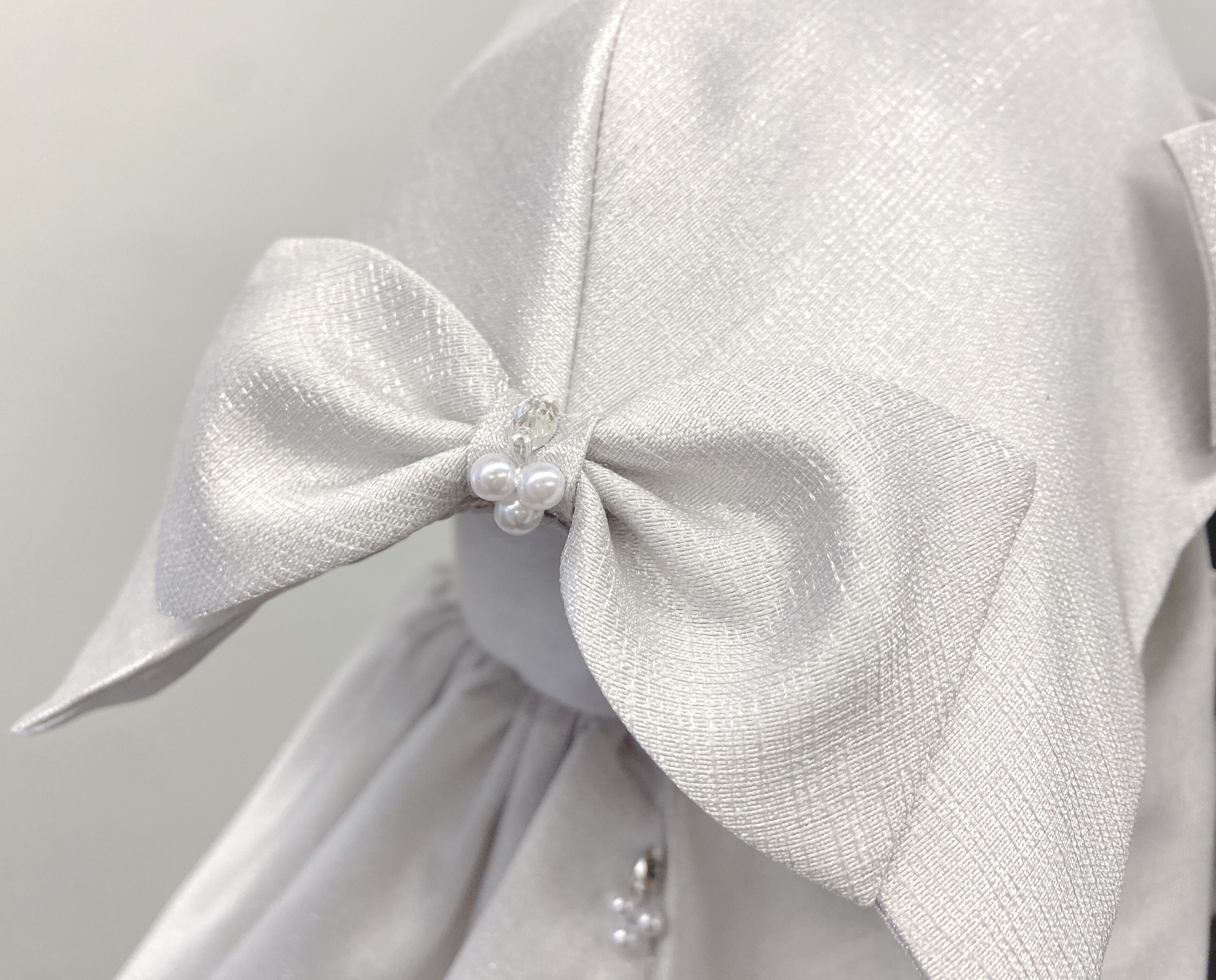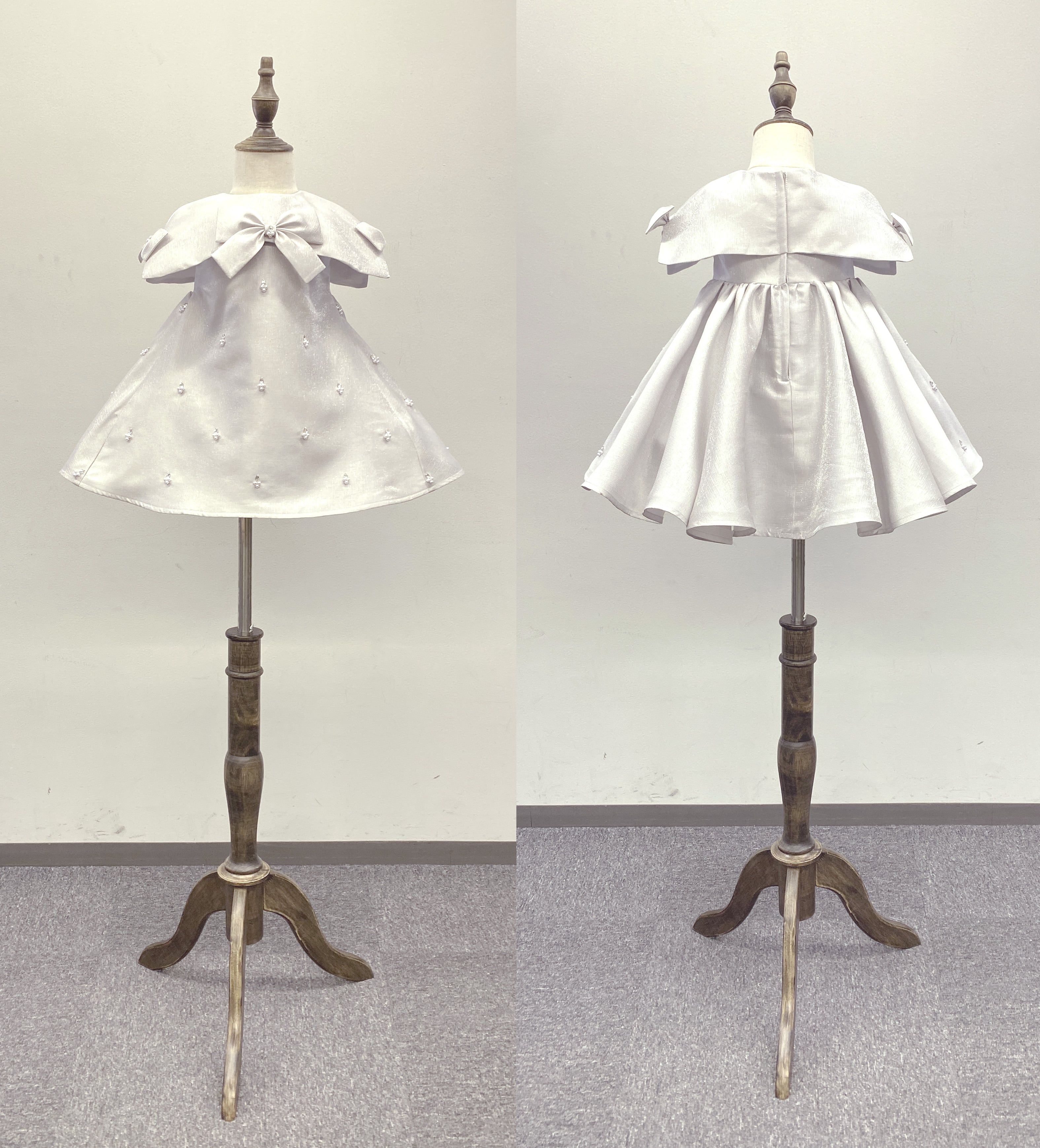 落ち着いた光沢の生地と張りのある襟周りが上品なベビードレス。襟のリボン・フロントのビーズ刺繍や、バックにボリュームのあるスカートがフェミニンかつ清楚なデザインのドレスです。