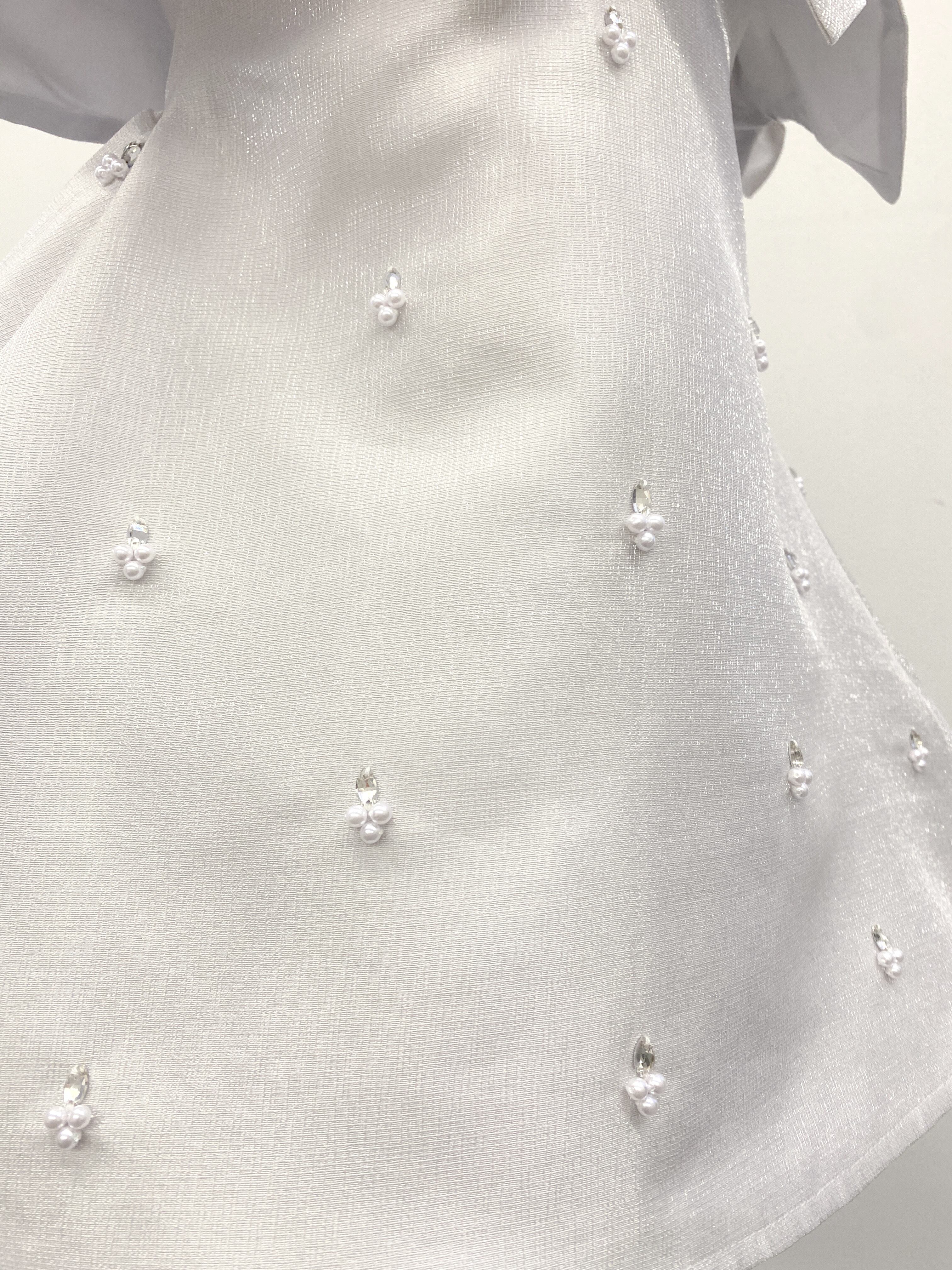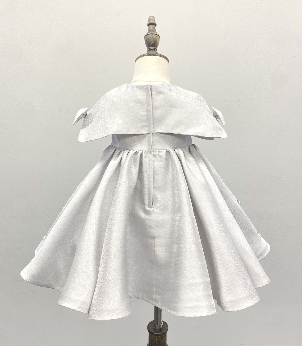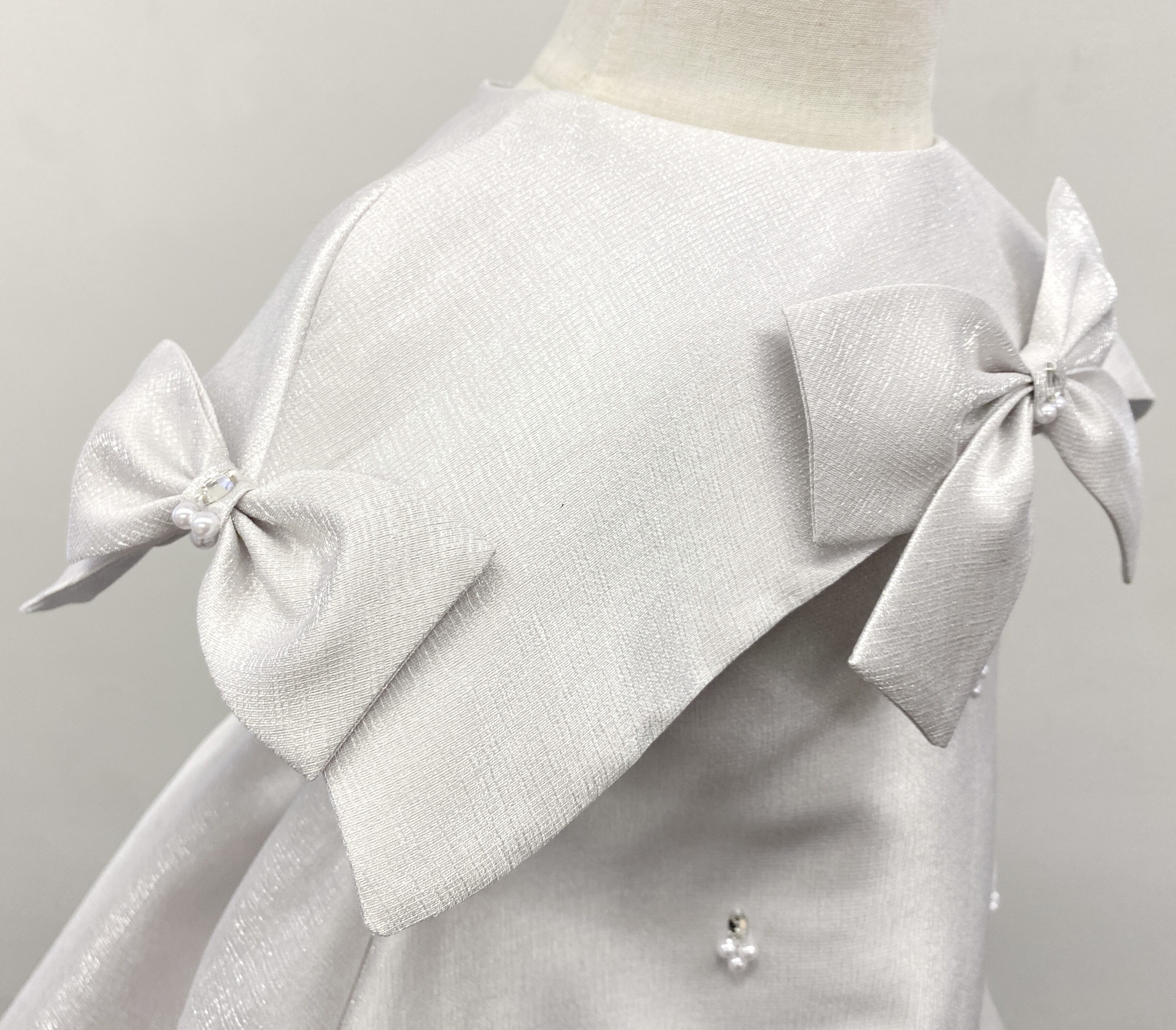 落ち着いた光沢の生地と張りのある襟周りが上品なベビードレス。襟のリボン・フロントのビーズ刺繍や、バックにボリュームのあるスカートがフェミニンかつ清楚なデザインのドレスです。