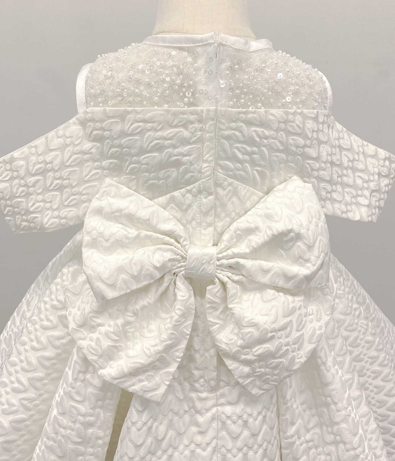 ハートモチーフで立体感のある生地が可愛らしいベビードレス。胸元のビーズ刺繍やスリーブ周りのデザインがエレガントな印象です。