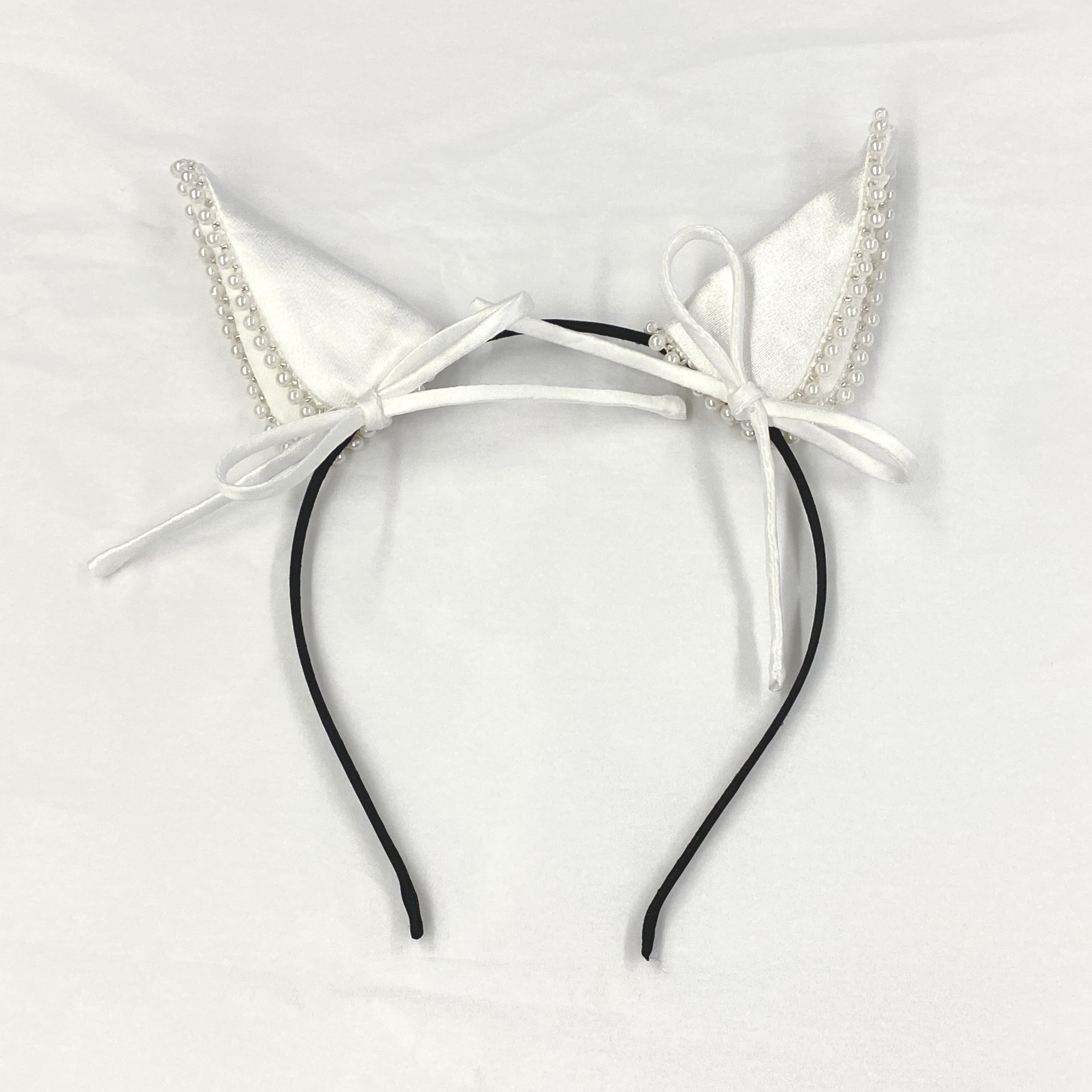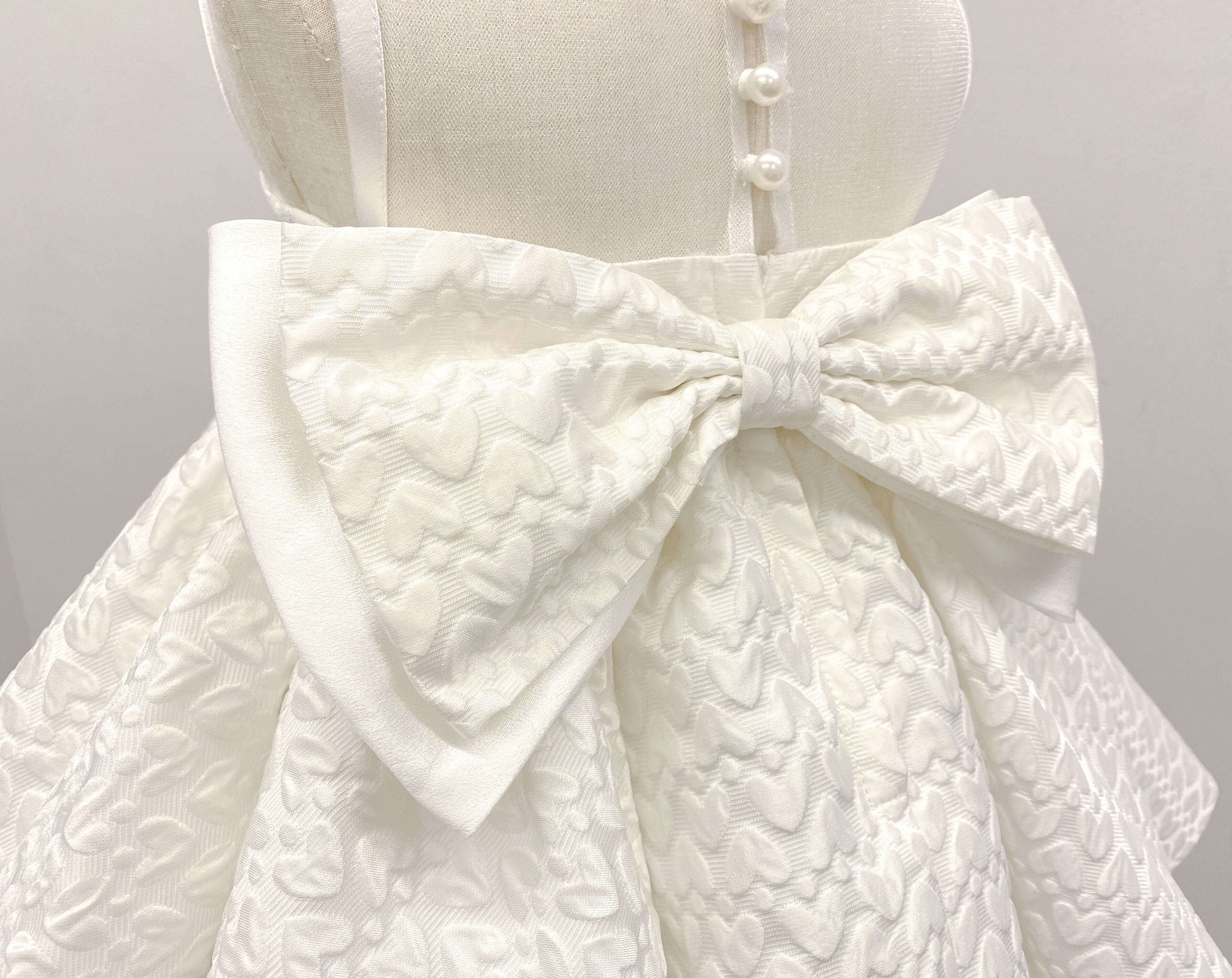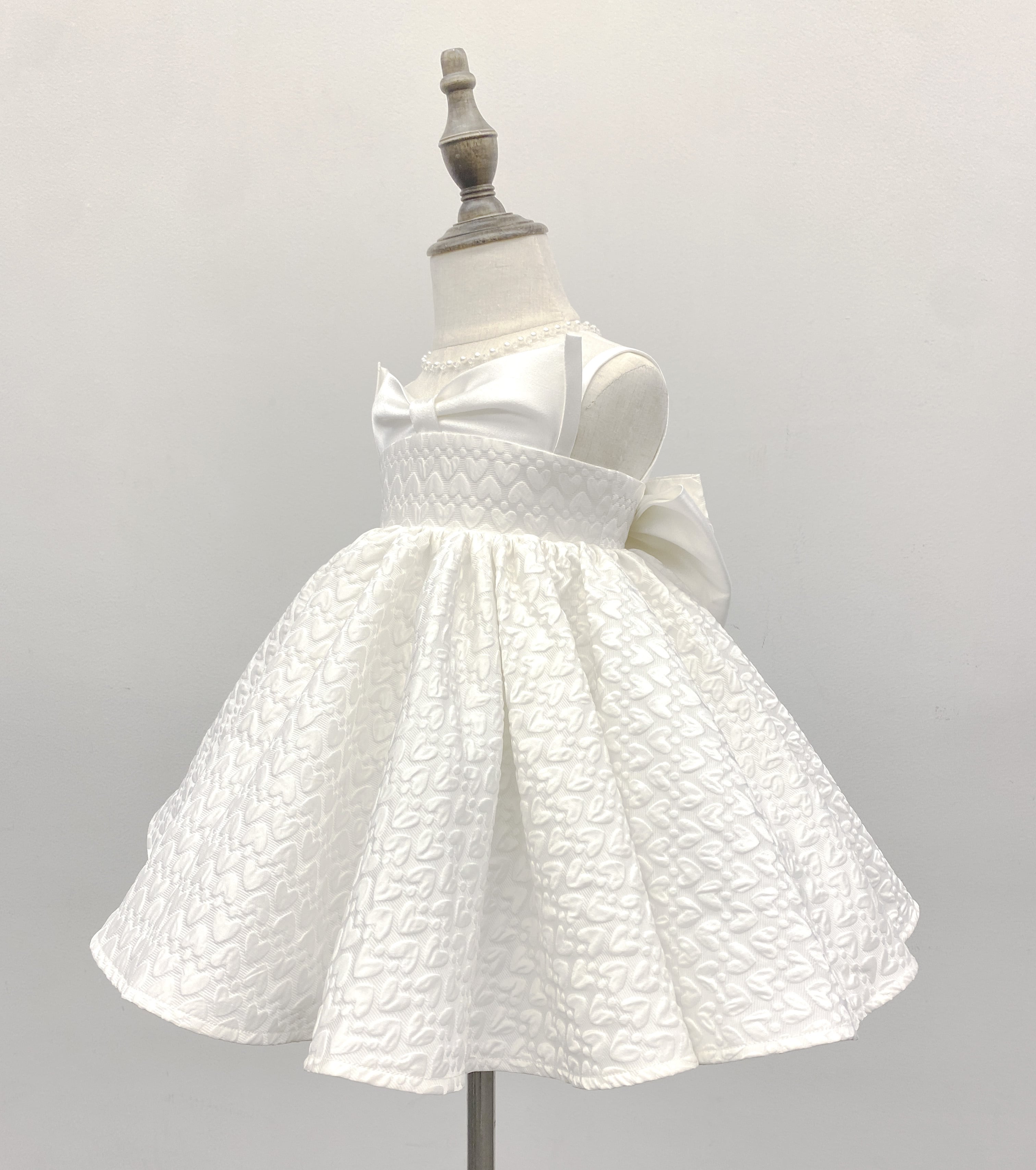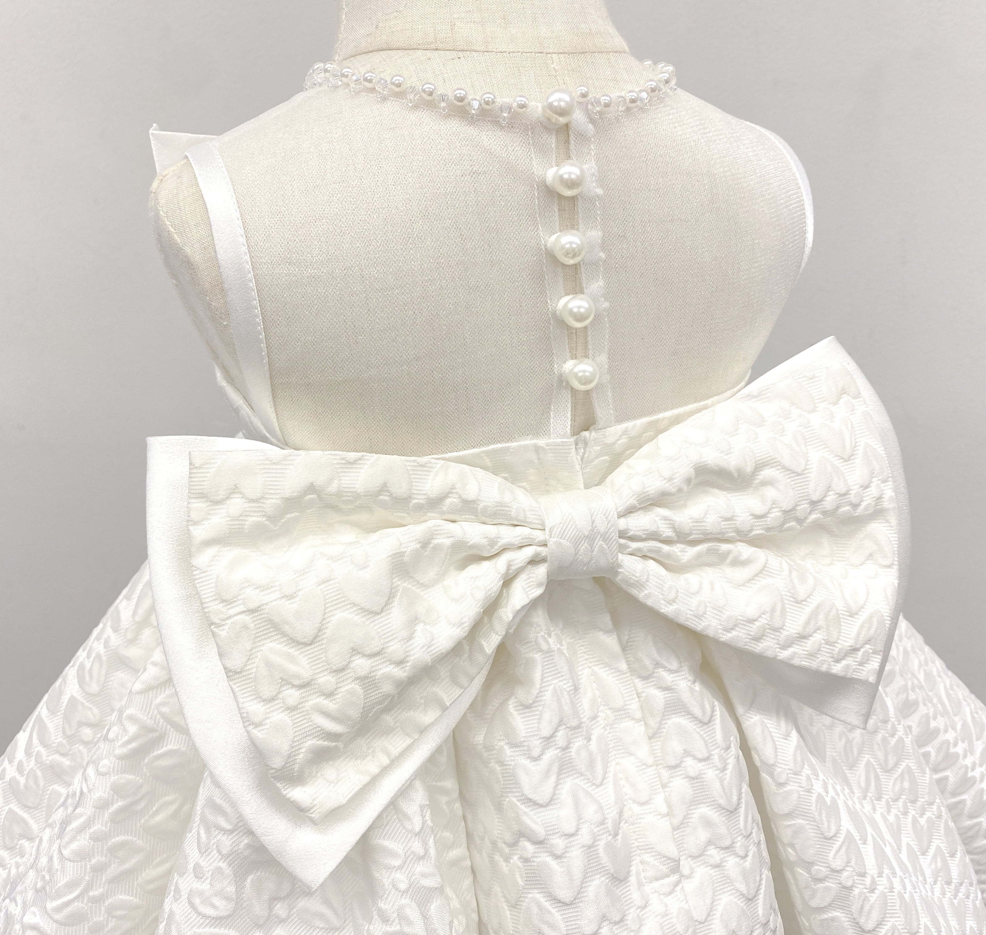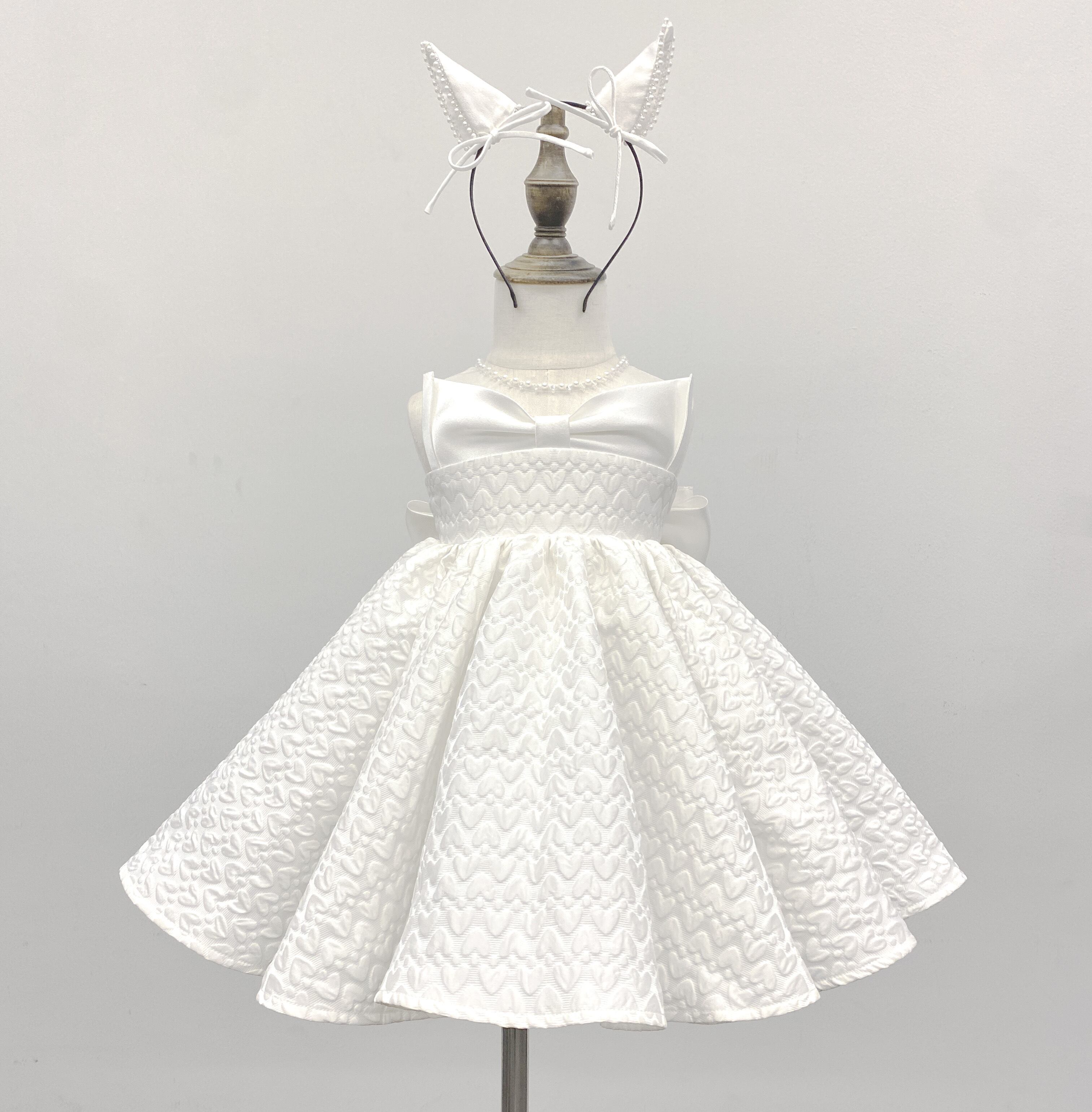 ハートモチーフで立体感のある生地が可愛らしいベビードレス。リボンやパールのあしらわれた猫耳カチューシャとセットです。