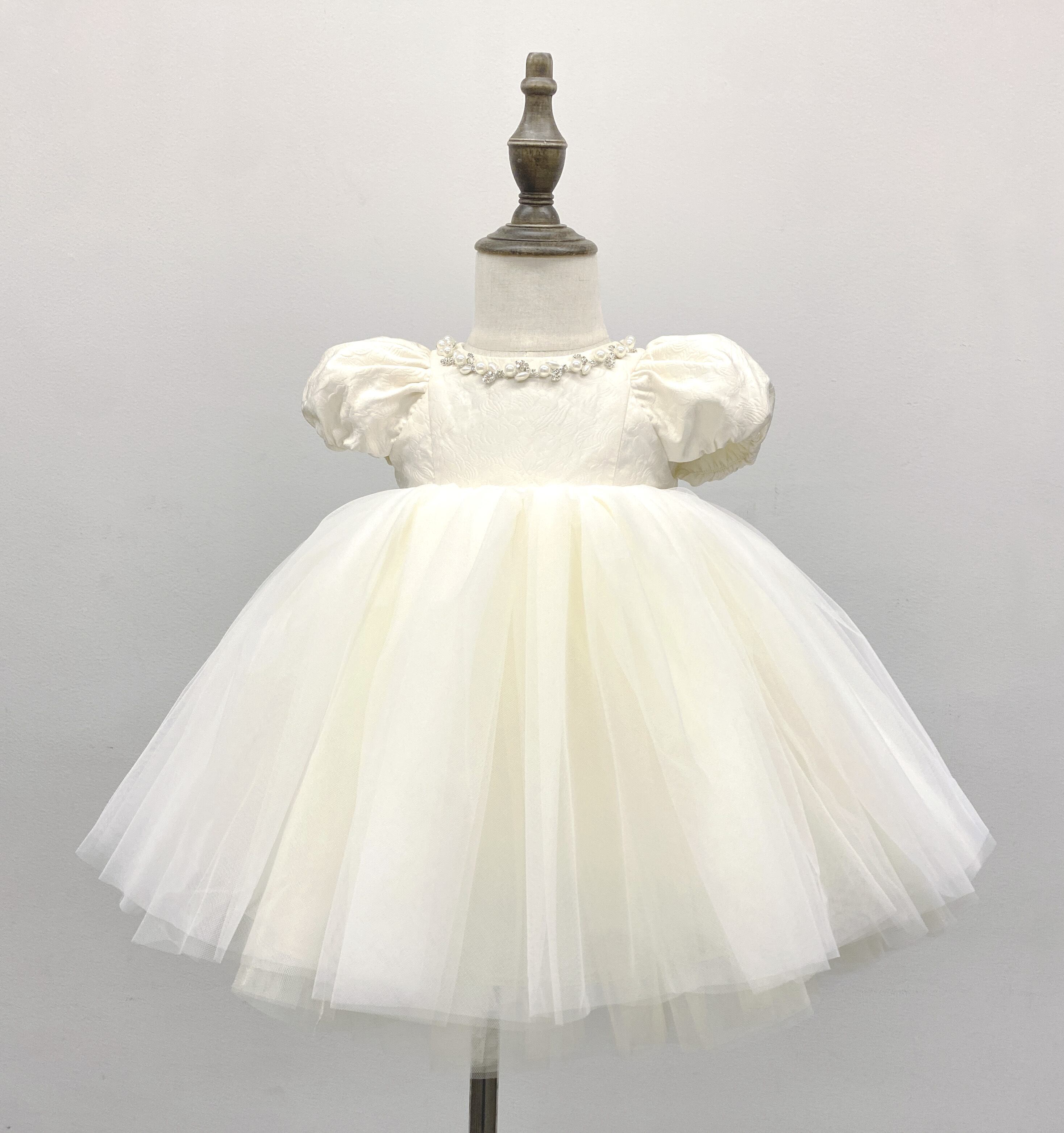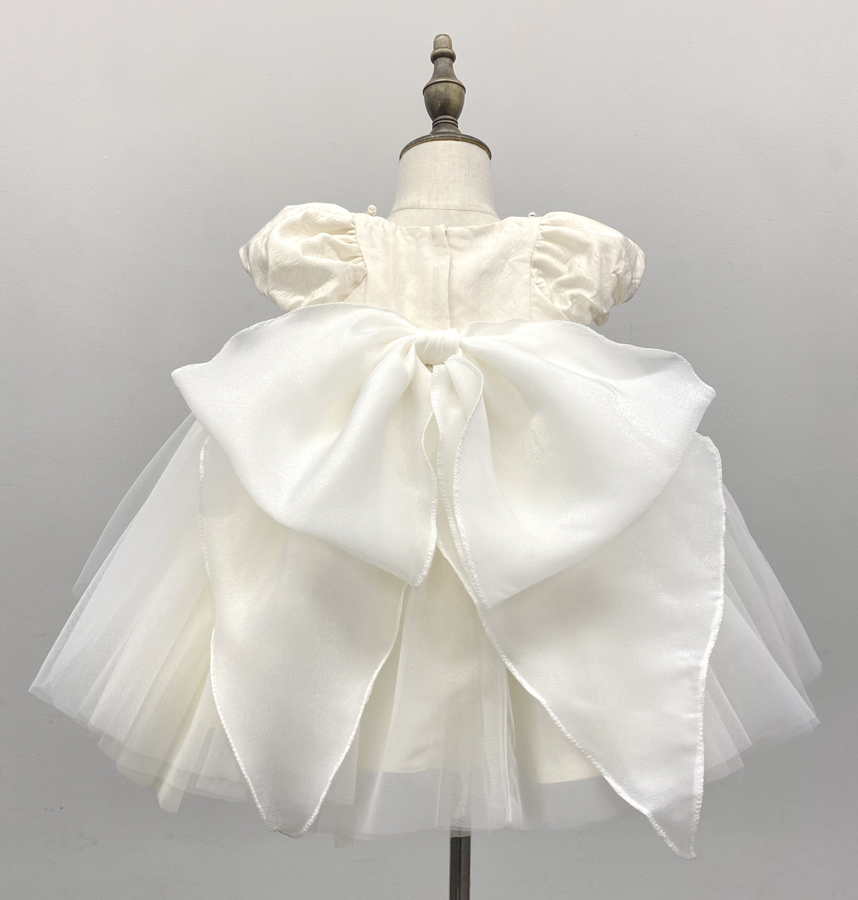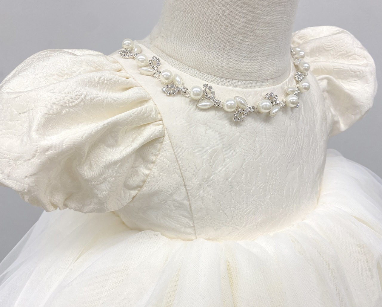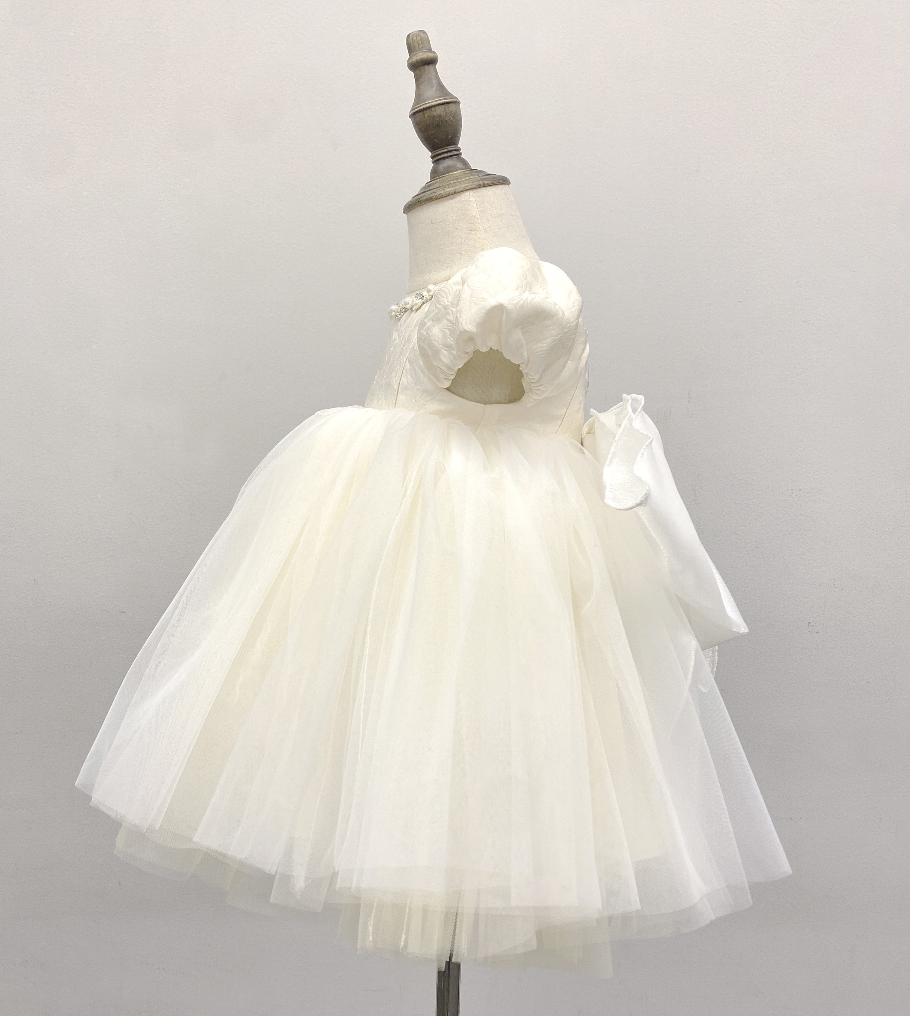 優しいオフホワイトカラーとチュールスカートが繊細な雰囲気のベビードレス。立体的な袖とバックの大きなリボンが可愛らしくフェミニンなデザインです。
