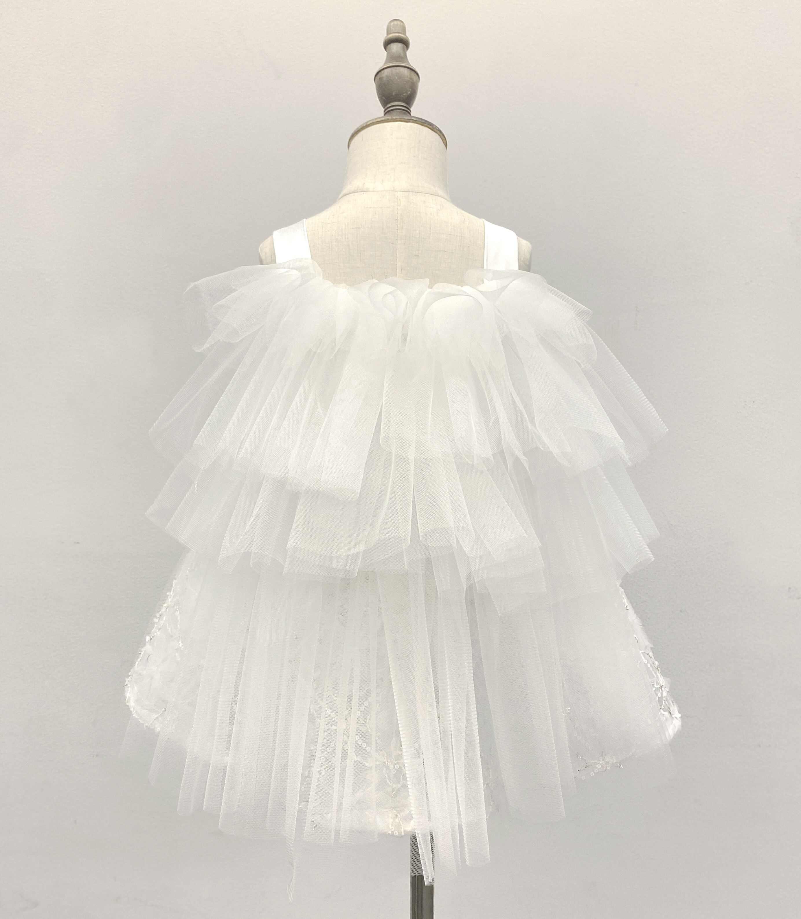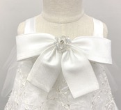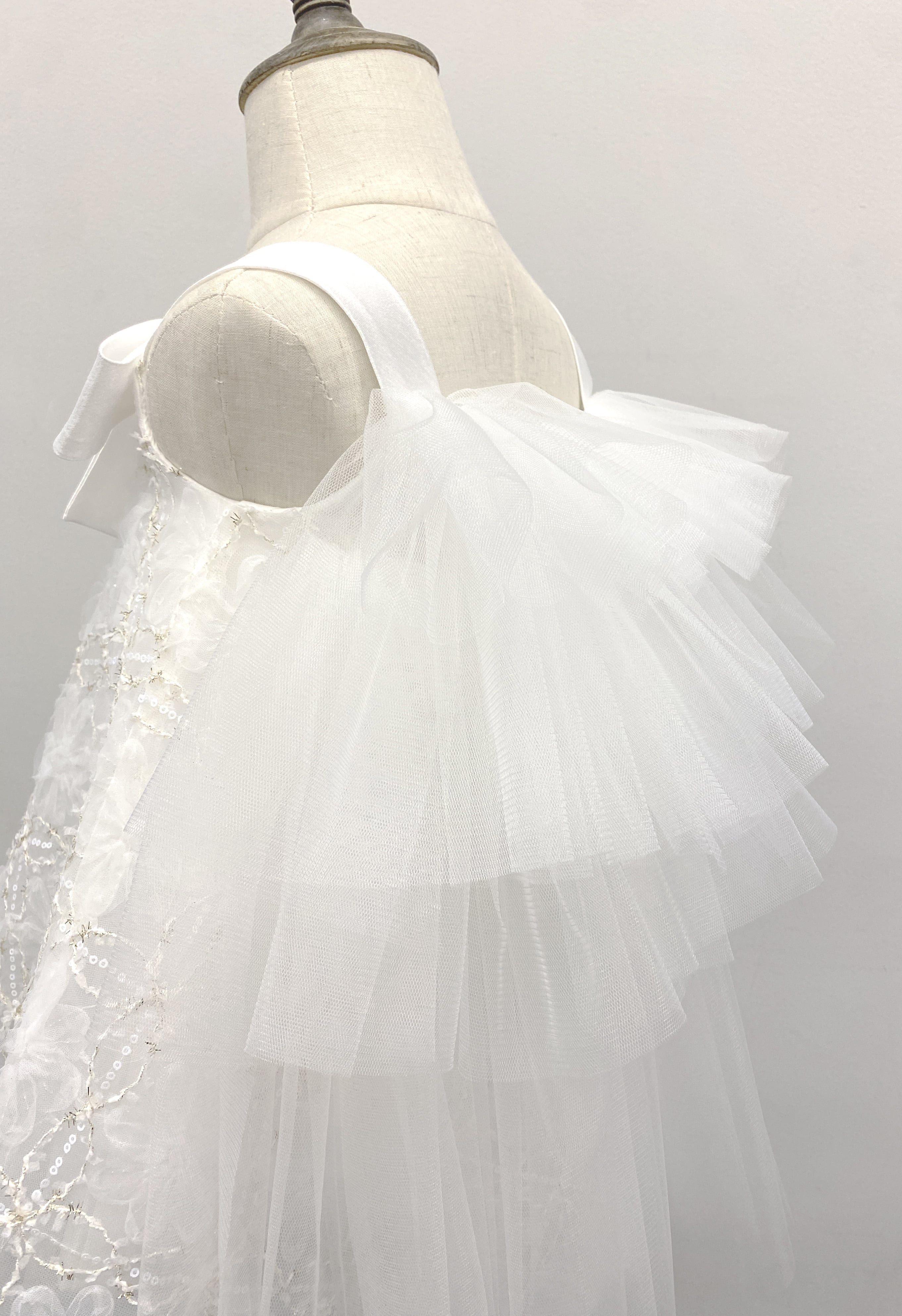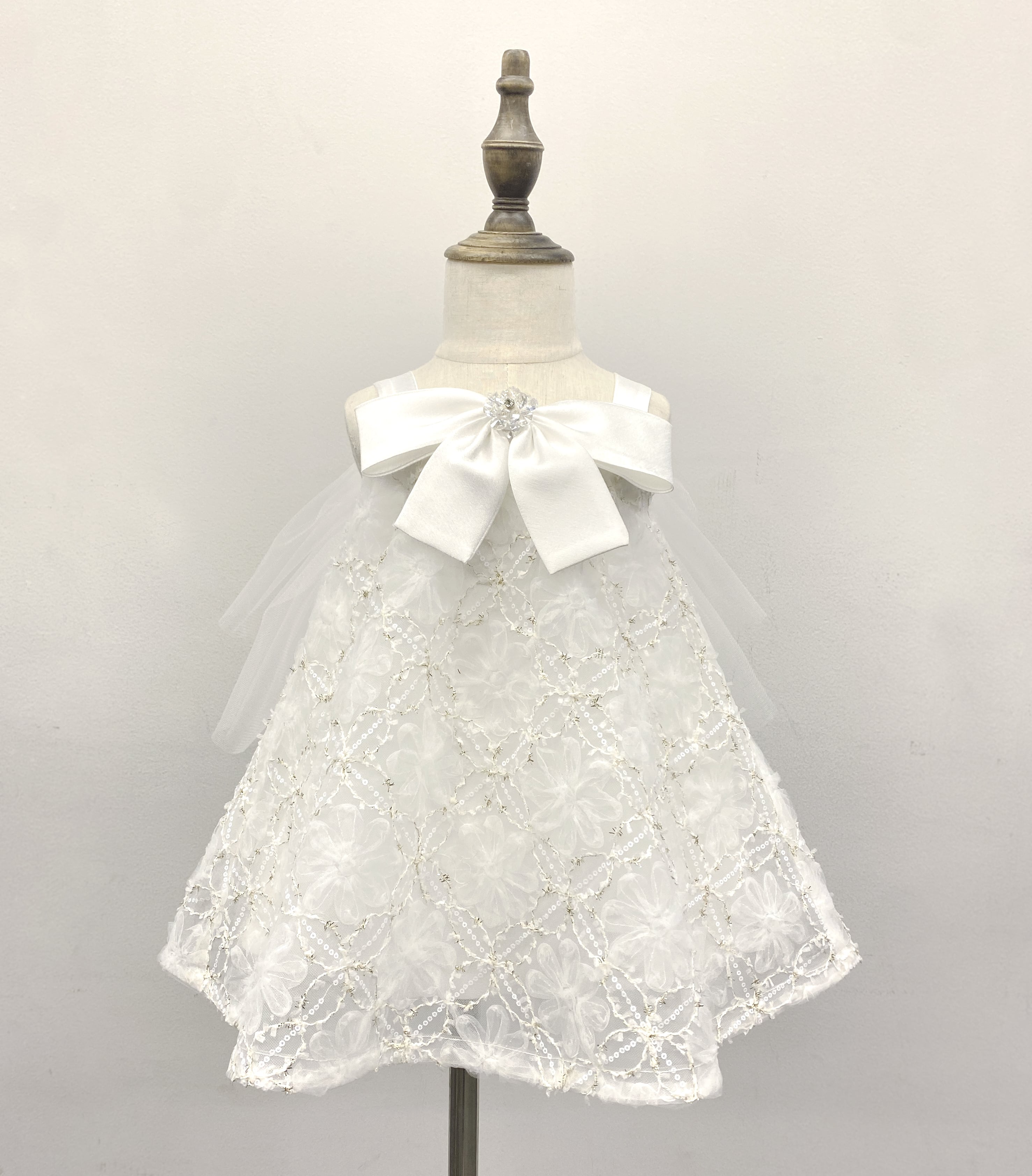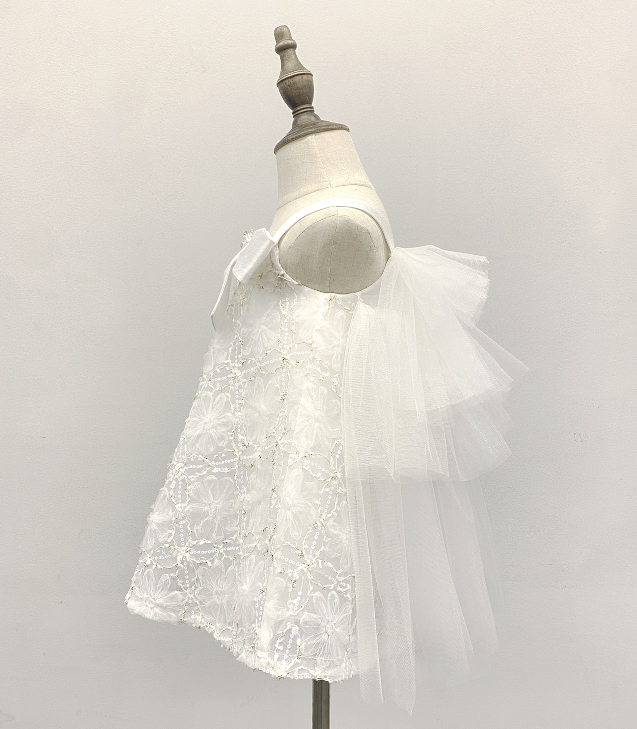 Aラインのシンプルなシルエットとバックのレイヤードラッフルが可愛らしいベビードレス。フロントはフラワーモチーフの刺繍生地と胸元のビジュー飾り付きリボンが華やかです。