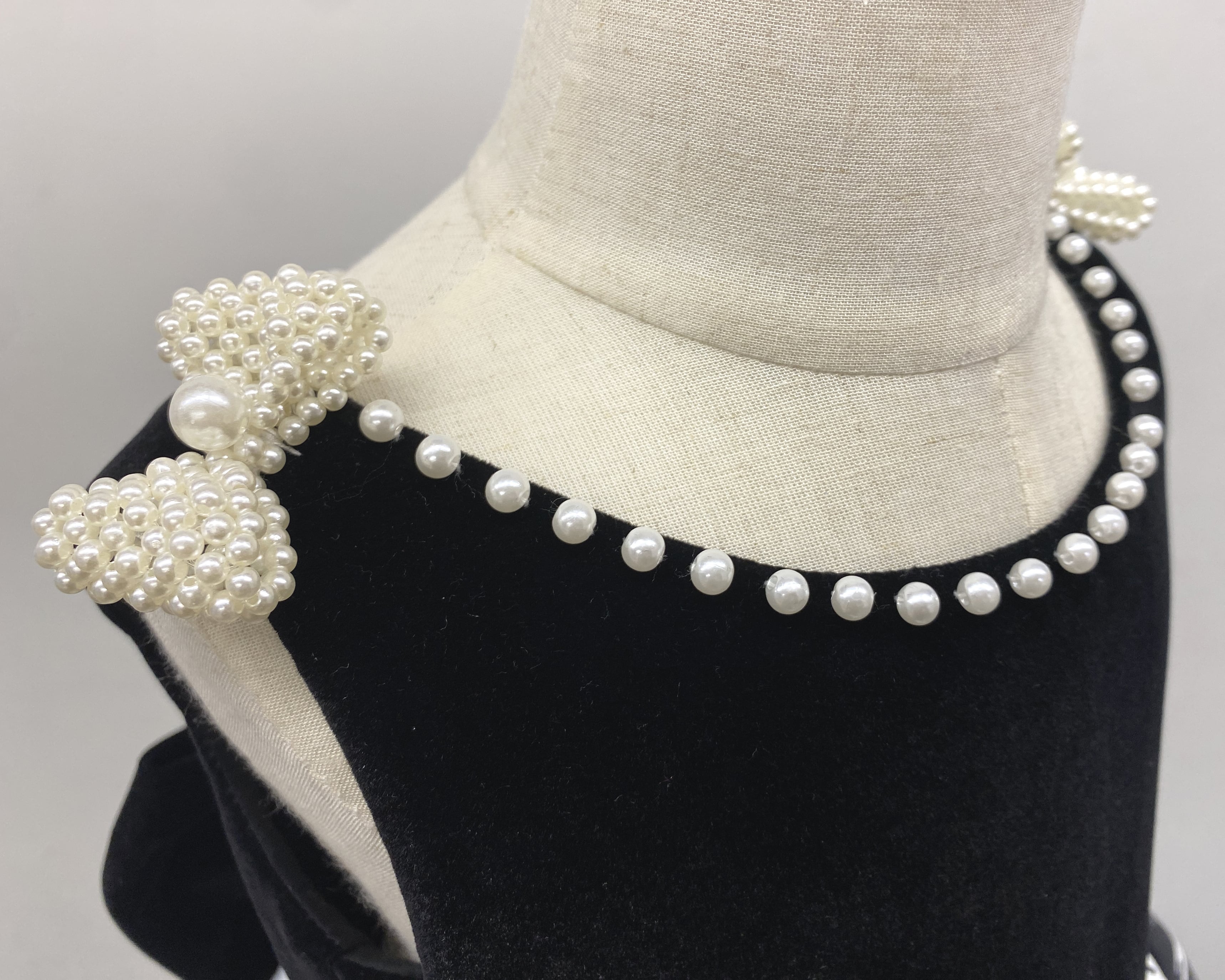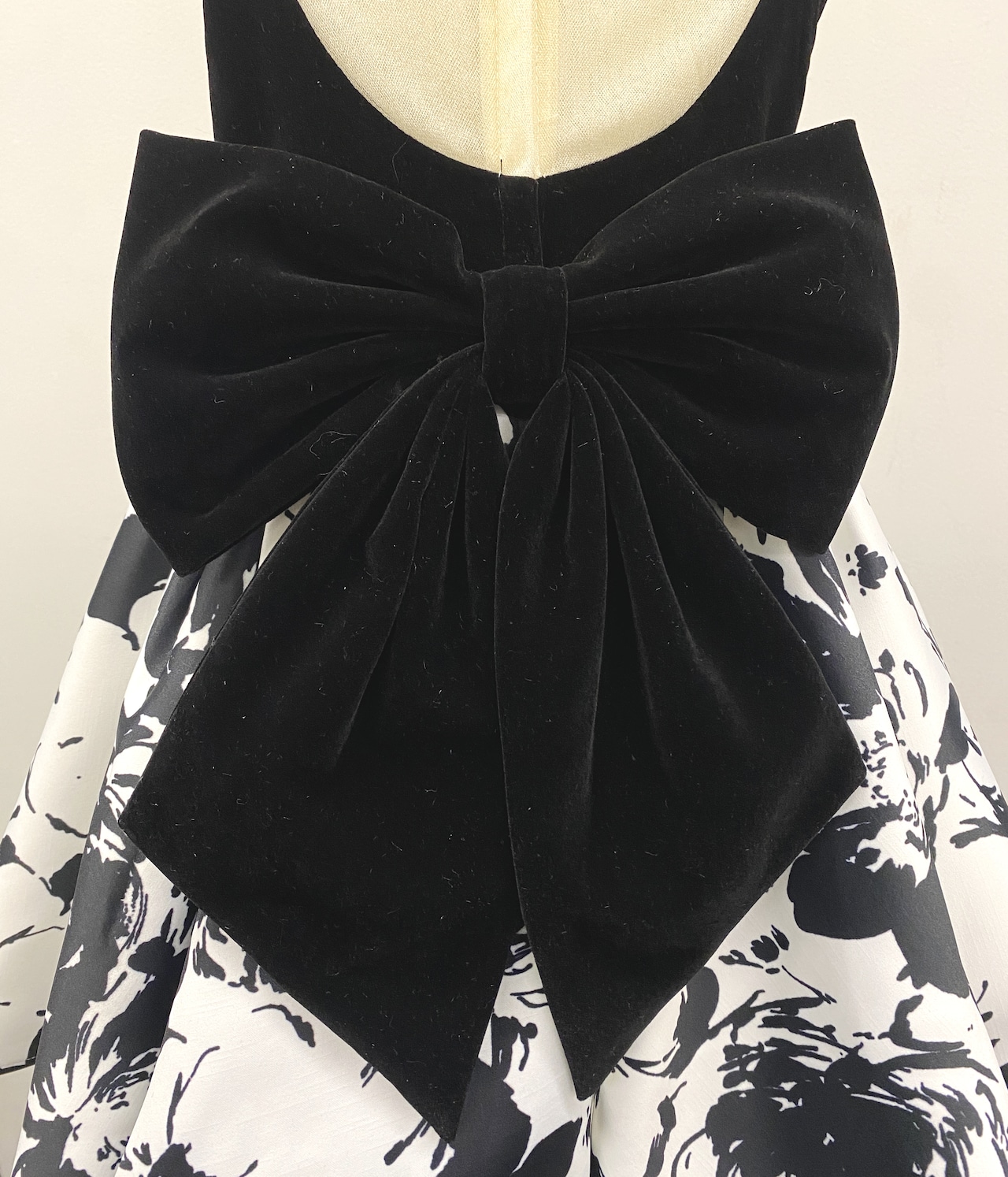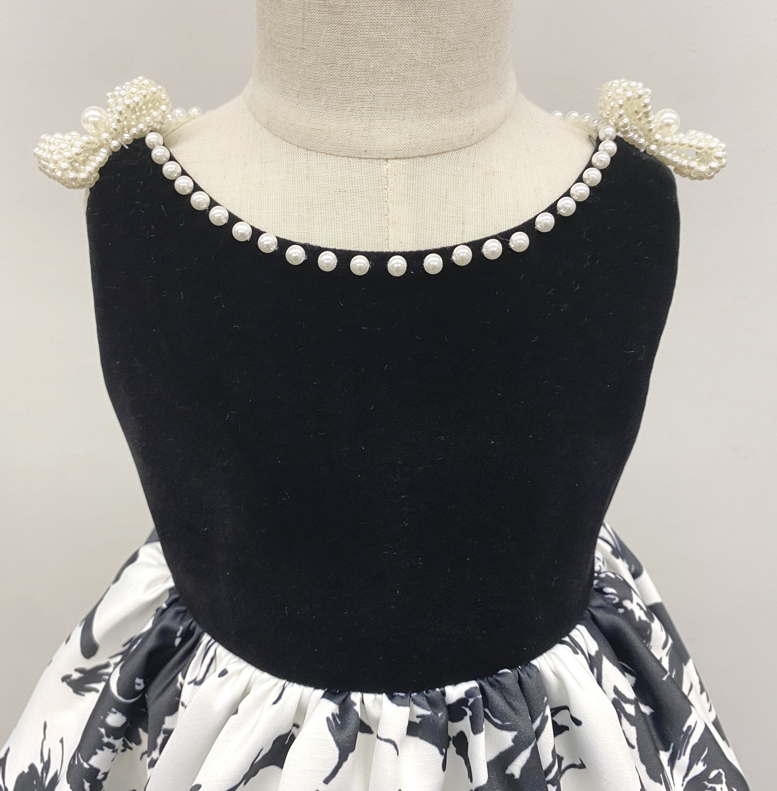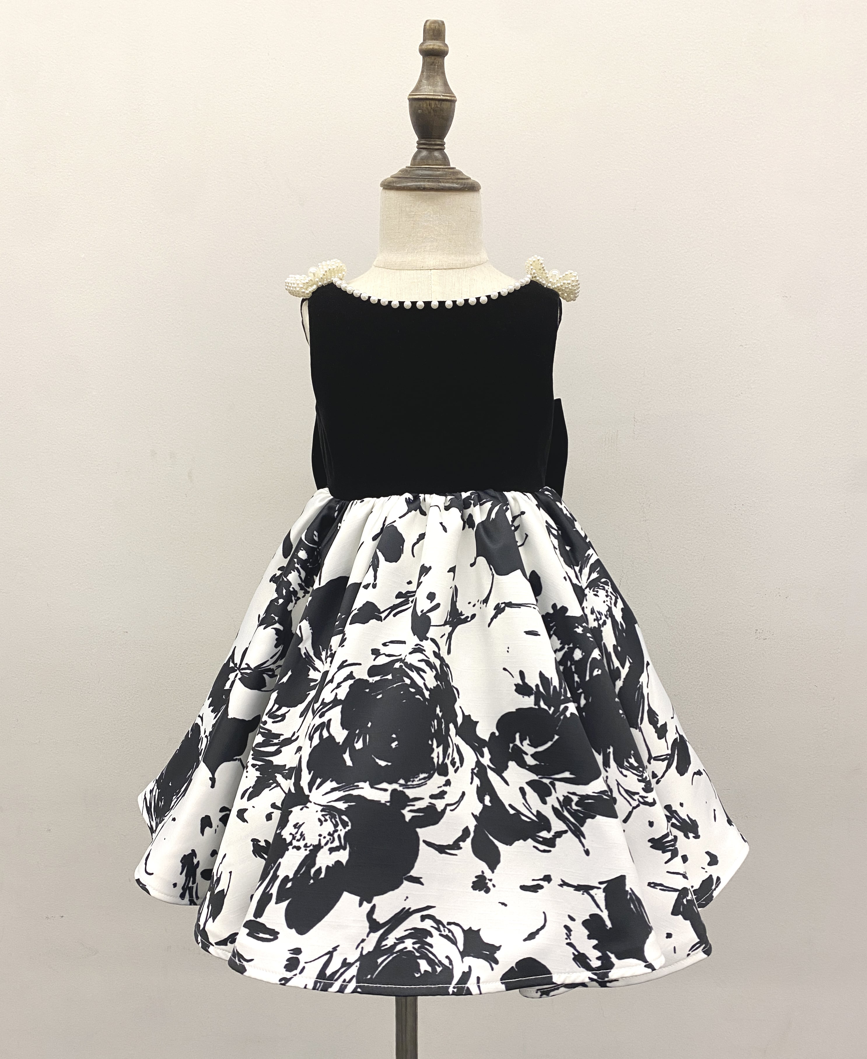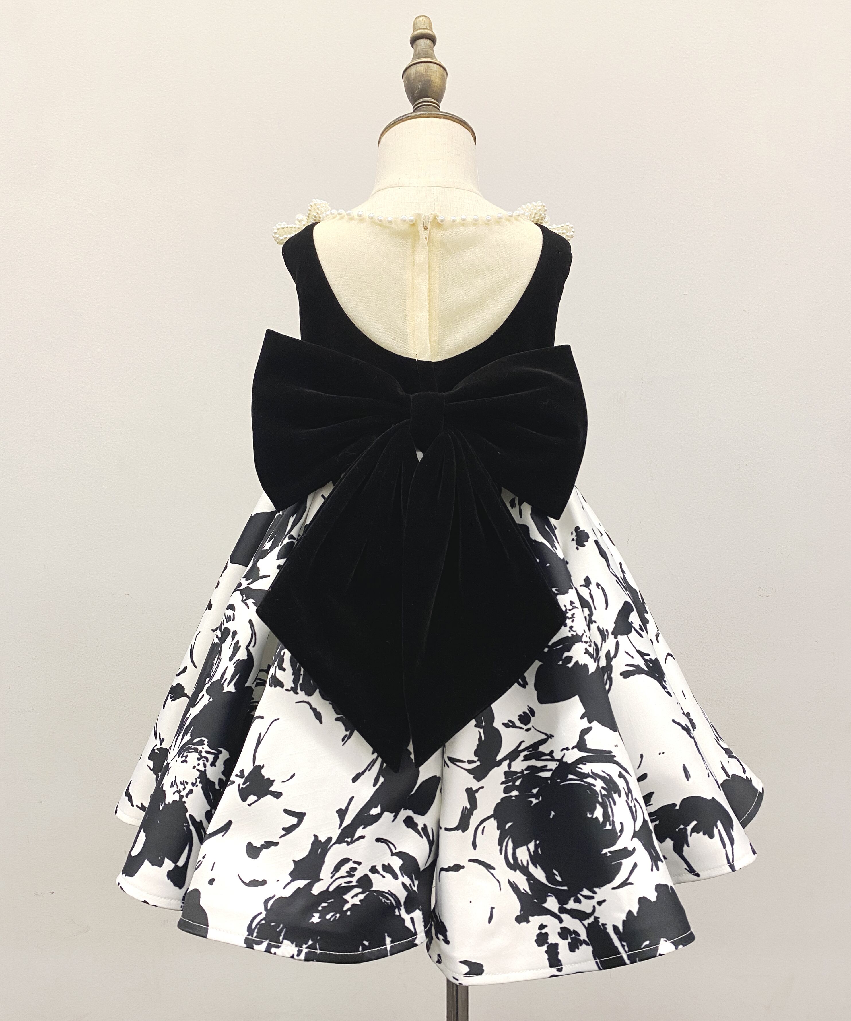 ベルベット生地にフラワーモチーフプリントのスカートが特徴のベビードレス。両肩のパールリボンとバックのベルベット生地リボンが華やかなデザインです。