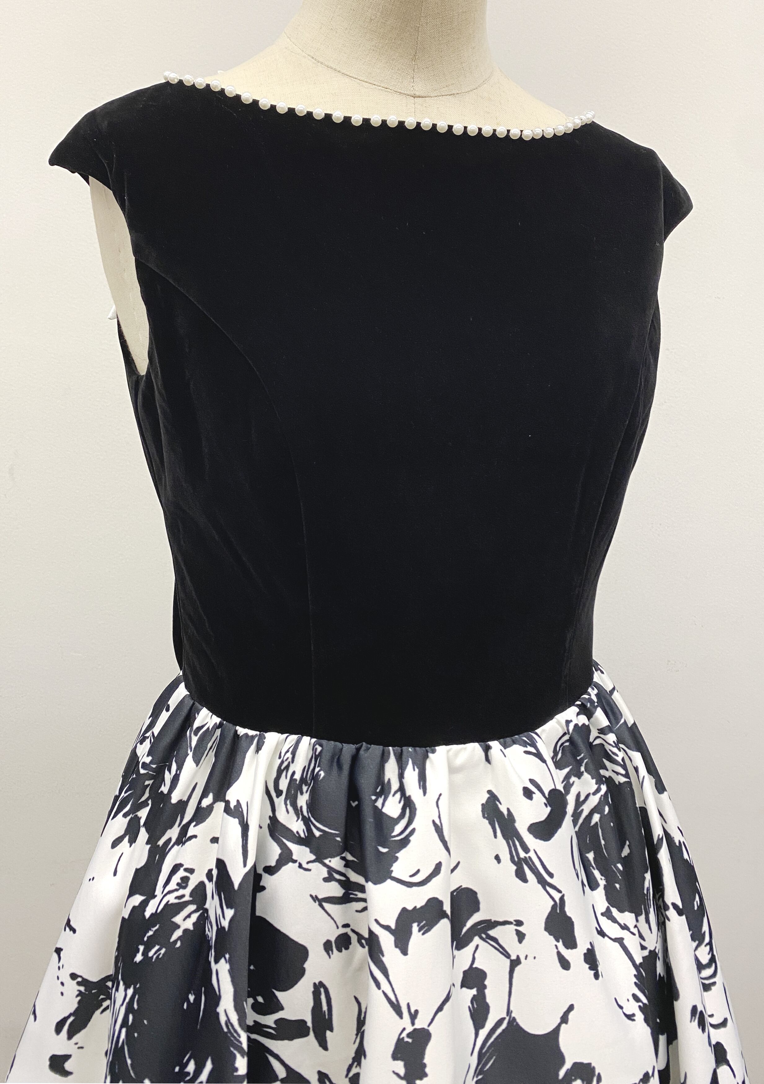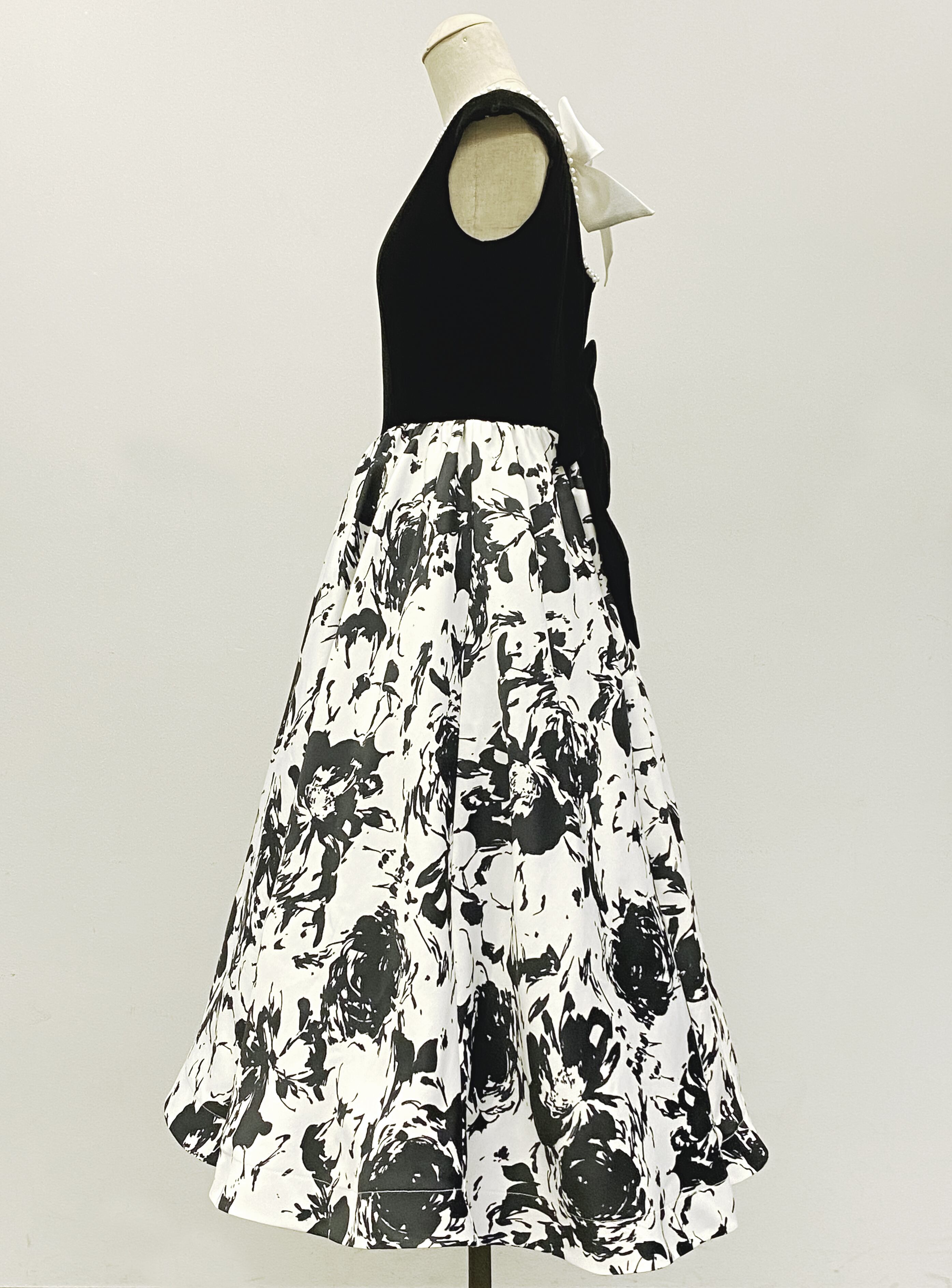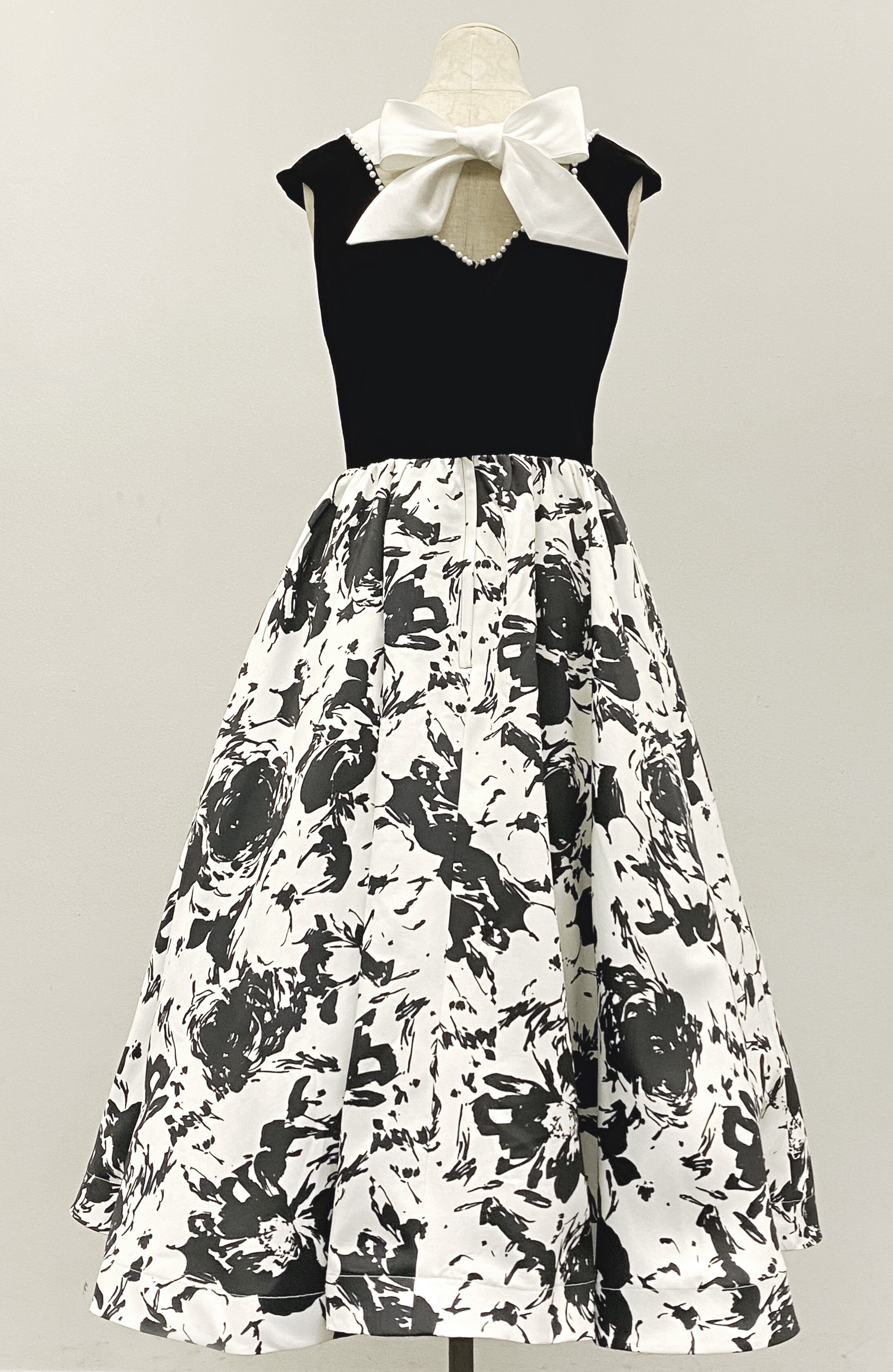 ベルベット生地にフラワーモチーフプリントのスカートが特徴のレディースドレス。バックのベルベット生地リボンは取り外し可能です。